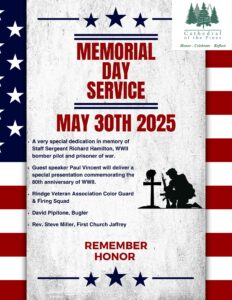 Join us for a special Memorial Day Service honoring those who have served and sacrificed for our country. This year, we will have a special dedication in memory of Staff Sergeant Richard Hamilton, a WWII B-17 gunner and prisoner of war. Guest speaker Paul Vincent will commemorate the 80th anniversary of WWII, along with tributes from the Rindge Veteran Association Color Guard & Firing Squad, David Pipitone (Bugler), and Rev. Steve Miller (First Church Jaffrey).